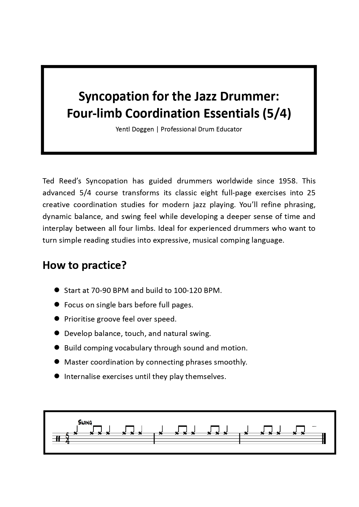 Ted Reed’s Syncopation has shaped jazz drummers since 1958. This advanced 5/4 course reinterprets its eight full-page exercises as 25 sophisticated four-limb coordination variations, mastering swing pocket, phrasing contrasts, and dynamic interplay at 70-120 BPM. Transform lines into gig-ready comping with ride patterns, feathered bass, rim-clicks on 2/4, and triplet layers.